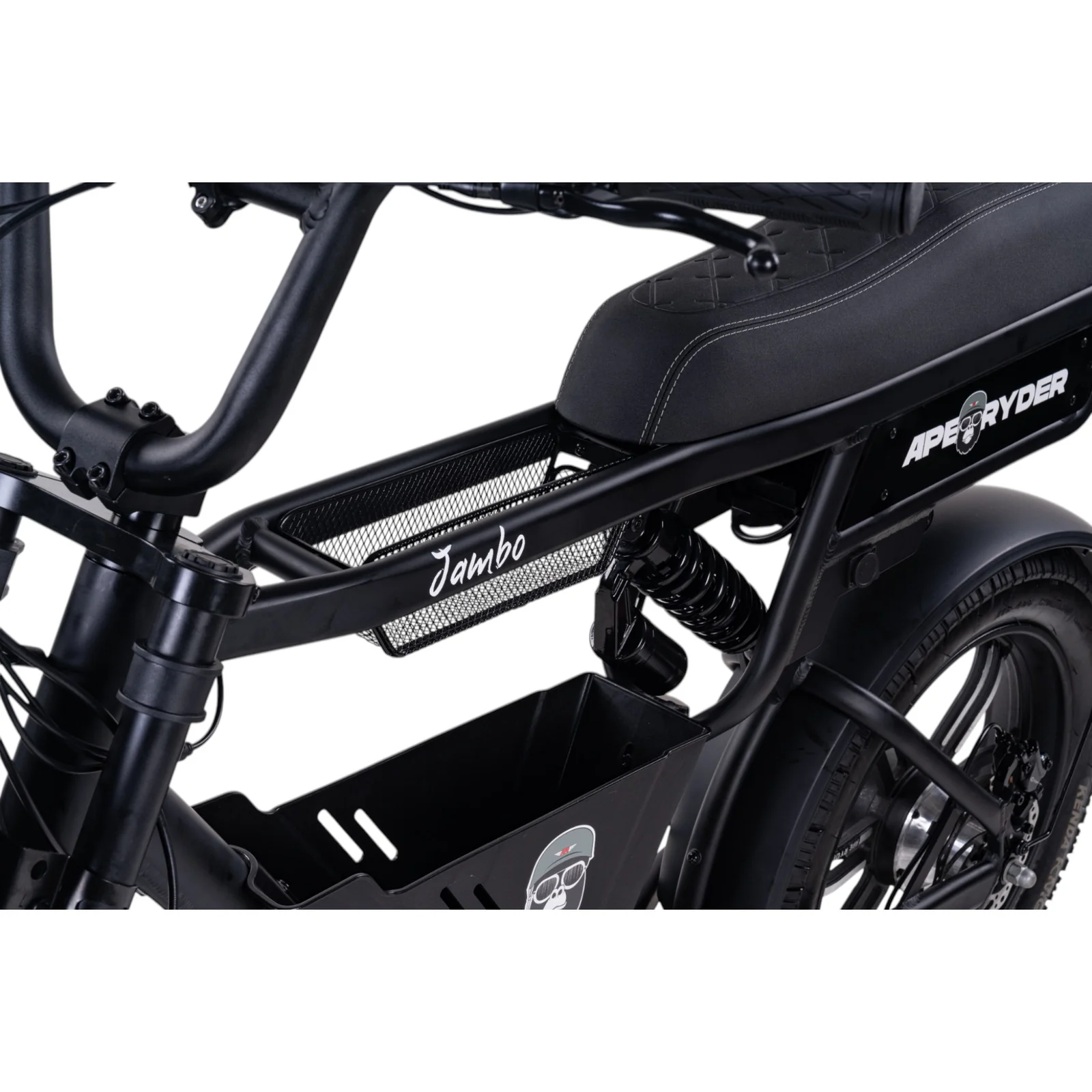 De Ape Ryder Jambo Matte Black is niet alleen functioneel, maar ook stijlvol. Het frame is gemaakt van een sterke aluminiumlegering, wat zorgt voor een lichtgewicht en duurzame constructie. Met watertransferstickers en een strak zwart ontwerp ziet deze e-bike er niet alleen fantastisch uit, maar is hij ook ontworpen om lang mee te gaan. De aluminium wielen en het Ape Head-logo op het zadel voegen een vleugje flair toe aan deze prachtige fiets.
